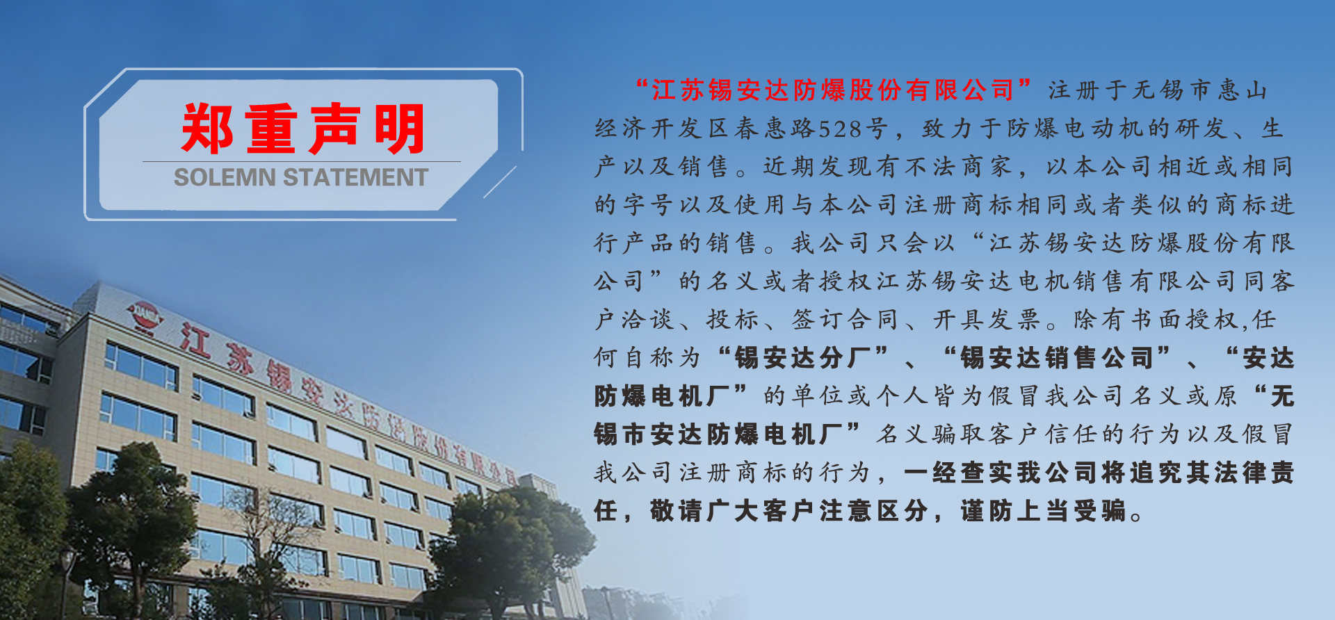 江蘇錫安達防爆股份有限公司由無錫市安達防爆電機廠和江蘇安達防爆機電集團有限公司組建而成,從1986年起開始生產(chǎn)防爆電機,是首批獲得全國工業(yè)產(chǎn)品生產(chǎn)許可證的防爆電機企業(yè)。